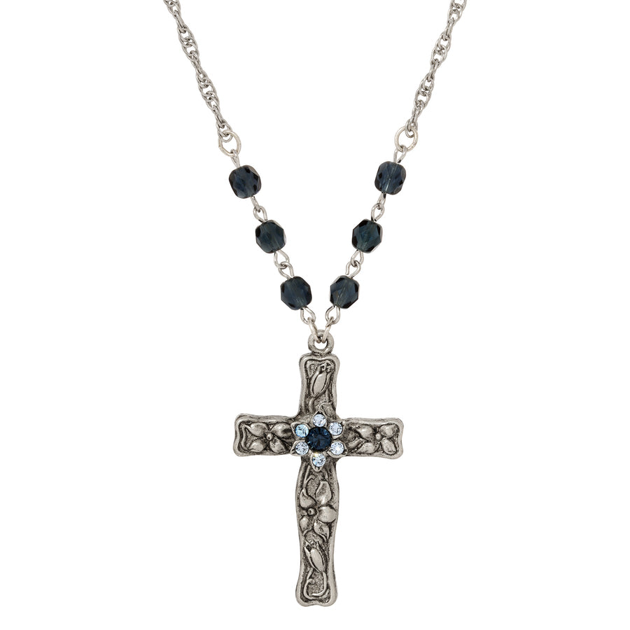 A beautifully designed antiqued inspired flower cross pendant featuring a light & dark Montana blue crystal flower at the center. The 28" chain features faceted fire polished glassed beads.