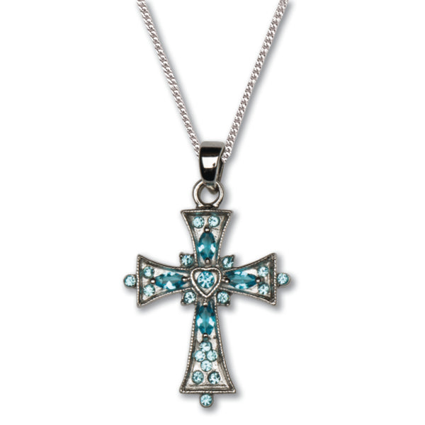 Sterling Silver Flared Cross with Blue Cubic Zirconias on 18″ light weight stainless steel chain.