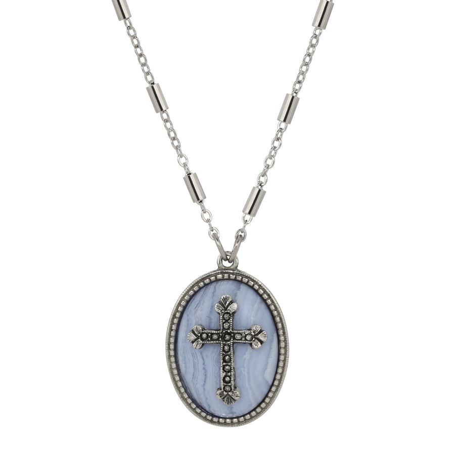 Oval Blue Lace Agate & Cross Pendant Necklace