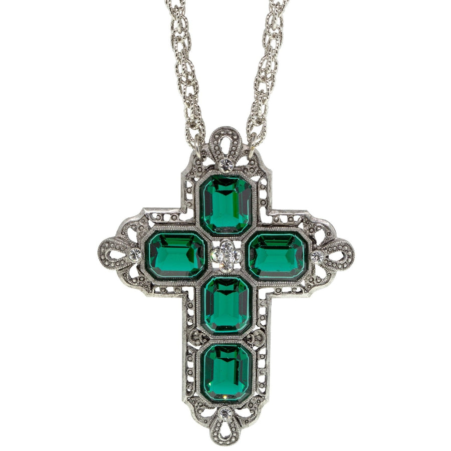 Regal Filigree Green Crystal Cross Pendant Necklace