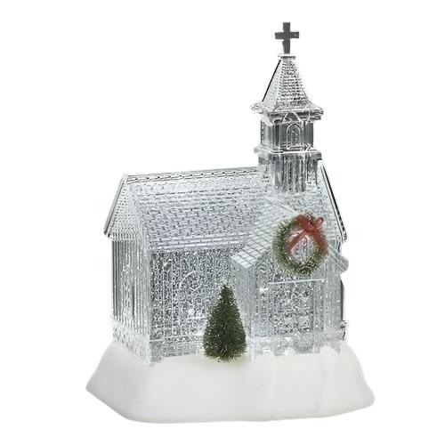 Lighted Swirl Clear Church with Green Wreath and Tree