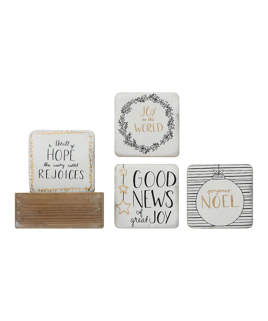 Protect your table from ring stains when you lay out these coasters showcasing delightful holiday-themed designs crafted using durable materials. Includes four: A thrill of hope, the weary world rejoices; Joy to the world.; Good news of great joy; and Joyous noel.