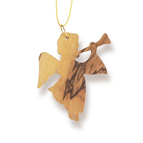 Angel with Trumpet (Vertical) Christmas Tree Ornament, Holy Land Olive Wood from Israel