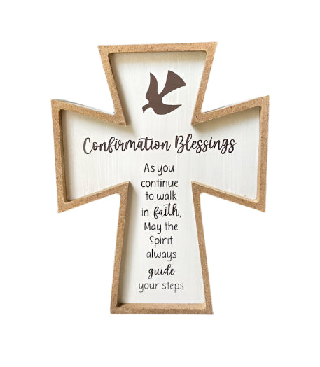 Framed Confirmation blessing cross decor made of screen-printed MDF. Hangs or stands. 5 ½” H x 4 ¼” W x 1” D. Boxed.