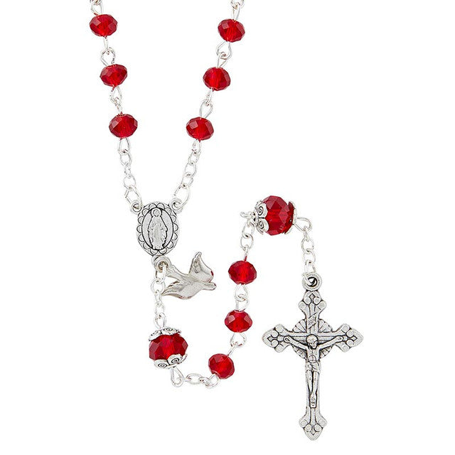 This rosary features red crystal beads, a crucifix with enamel inlay, and a holy spirit medal centerpiece with beautiful construction. This unique piece is sure to make a great spiritual gift for those with a special devotion and confirmation.