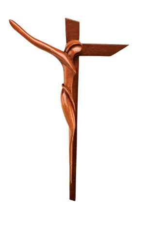This 12 inch tall wall Crucifix is made of solid mahogany. Sleek modern designed cross and corpora.