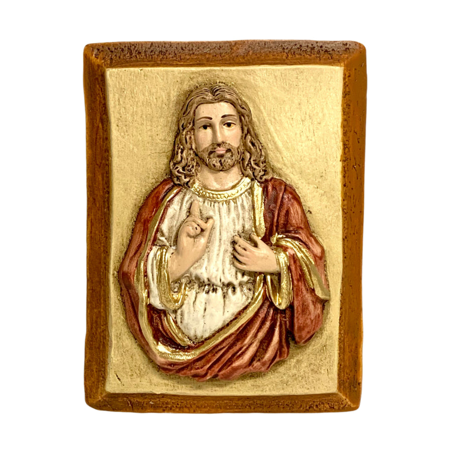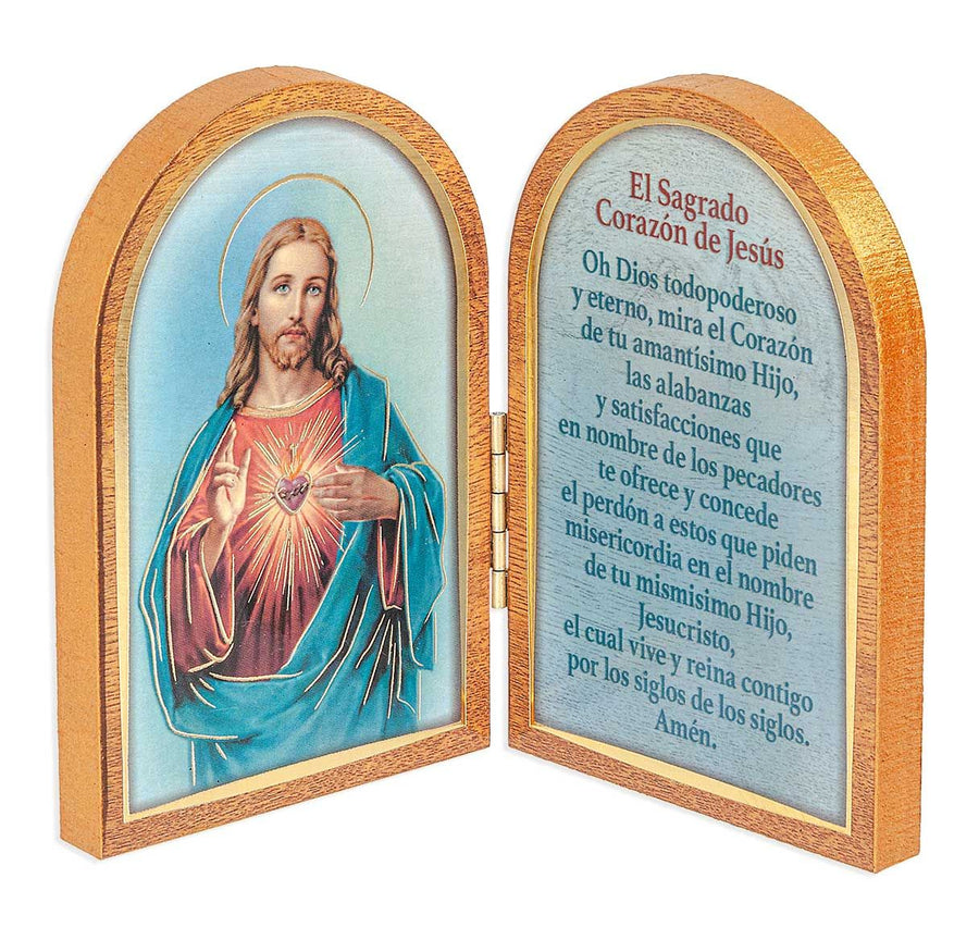 3.5" Sacred Heart of Jesus Standing Natural Wood Diptych in Spanish