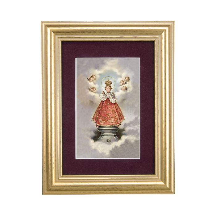 Our Gold Framed Italian Prints are elegant, and beautiful quality. Our 'Infant of Prague' image is from our exclusive Italian 'Bonella' collection, and sits in our wood gold frame, with soft velvet maroon matting, under glass. This elegant framed art is the perfect gift for any occasion. Give as a special gift for Weddings, Anniversaries, Birthdays, or Christmas.