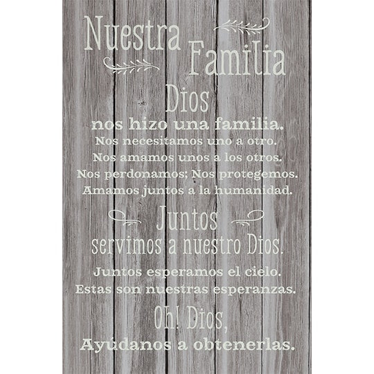 "Nuestra Familia Dios nos hizo una familia. Nos necesitamos uno a otro. Nos amamos unos a los otros. Nos perdonamos; Nos protegemos. Amamos juntos a la humanidad. Juntos servimos a nuestro Dios. Juntos esperamos el cielo. Estas son nuestras esperanzas. Oh! Dios, Ayúdanos a obtenerlas." The words are beautifully displayed on this elegant plaque.