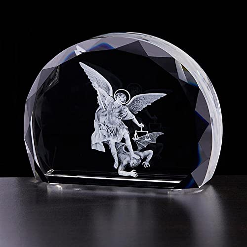 This Etched Glass Stand from Jeweled Cross features a 3D image of Saint Michael in the center. The crystal clear look makes it a good home décor piece.