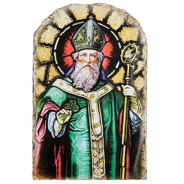 Using the arched shape of a cathedral window, this arched tile plaque featuring St. Patrick is perfect for any home or garden.