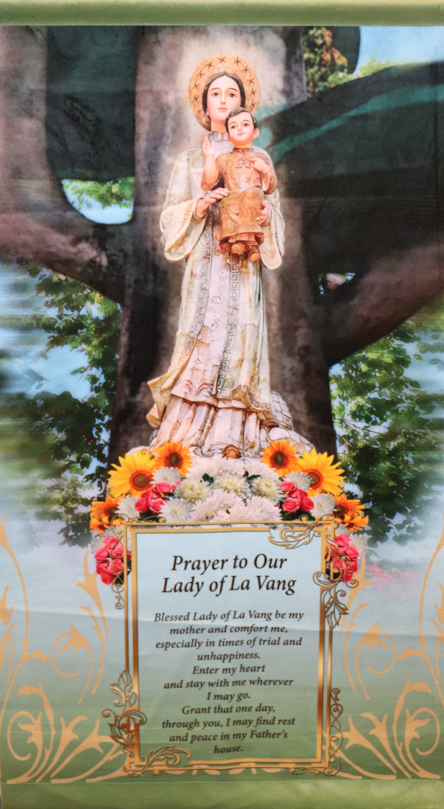 This beautiful printed tapestry of Our Lady of La Vang is made by Catholics and printed in the USA.