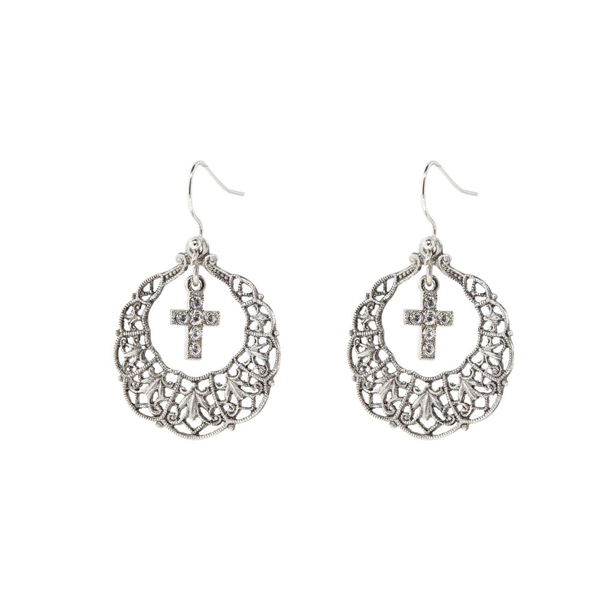 Featuring a pair of beautiful pewter vintage style filigree hoop earrings. Our dainty filigree earrings showcase a cross encrusted with tiny clear crystals. Crystal cross has the right amount of shimmer as it dangles in the center of the hoop earrings. This pair of pewter filigree earrings is a real wealth of traditional, vintage-style beauty, and a bohemian lifestyle. Gorgeous filigree earrings are a must-have and make a perfect and affordable gift for her.