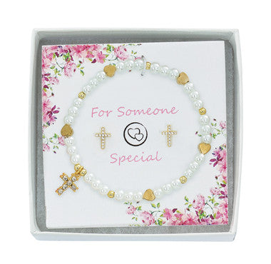 Gold Plated Pearl Stretch Bracelet with Gold Plated Pearl Earrings. Comes on a Someone Special Card and Box
