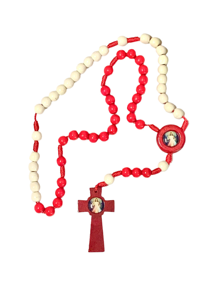 10MM Red & White Wood Divine Mercy Rosary