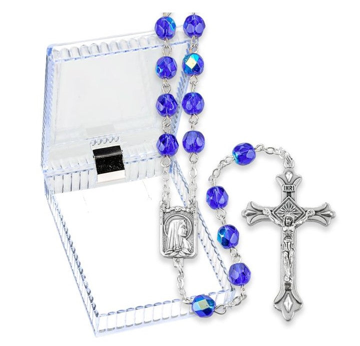 6mm Dark Blue Glass Bead Rosary with Deluxe Center and Crucifix
