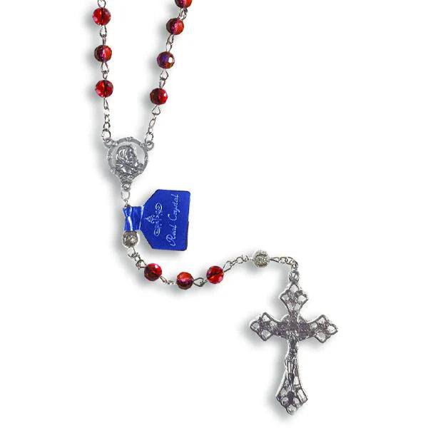 Experience the beauty and wonder of the Red Aurora Borealis Crystal Bead Rosary. Crafted with 6mm Red Aurora Borealis crystal beads, complemented by Silver Filigree Our Father Beads, and adorned with a Silver plated centerpiece and crucifix, this rosary is both elegant and meaningful. Measuring 20" in length, it comes in a plastic case and is proudly made in Italy.