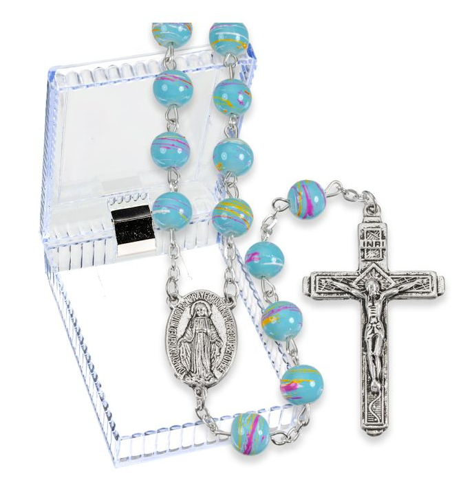 - 8mm Aqua Colored Swirled Glass Bead Rosary.