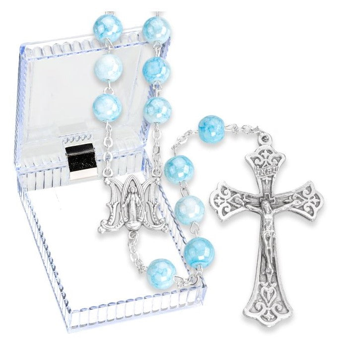 - 8mm Round Aqua Marbleized Glass Bead Rosary.