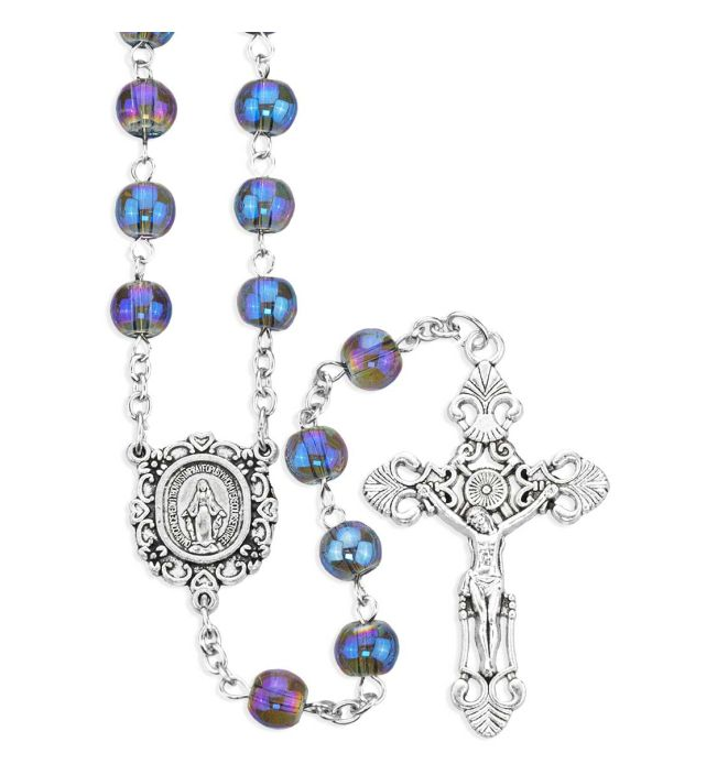 • 8mm Glass Sapphire and Violet Aurora Borealis Bead Rosary.
