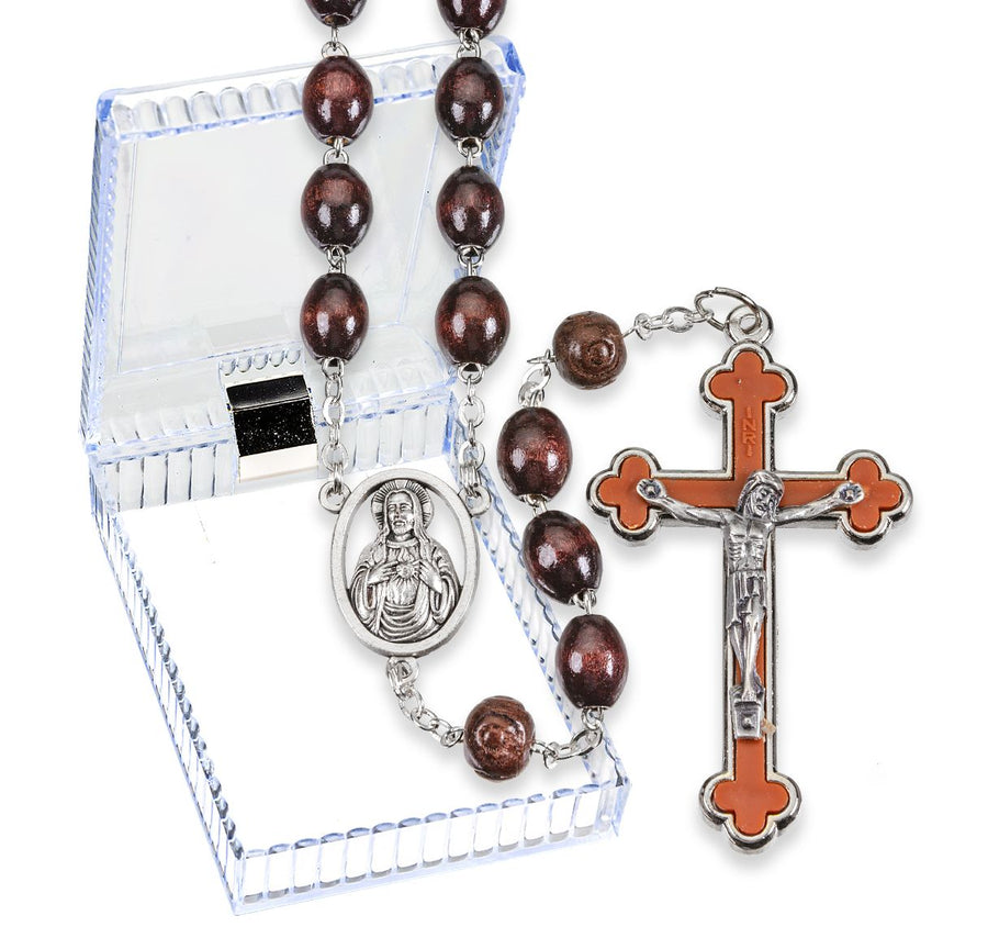 • 8 x 10mm Oval and Round Dark Brown Wood Bead Rosary with Carved Pater Beads.