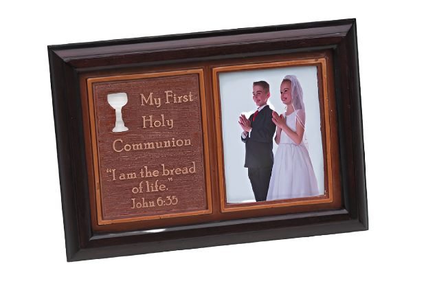 Mahogany picture frame with cut-out chalice and "My First Holy Communion" resin decorative inset.