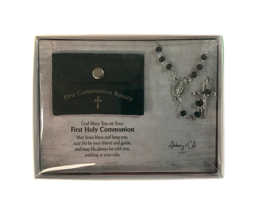 This sweet pouch and rosary set celebrates your loved one's first Communion, the 2.75" x 1.83" pouch reads, "First Communion Rosary" and has a snap closure. The 4mm black bead rosary features a miraculous medal and crucifix.