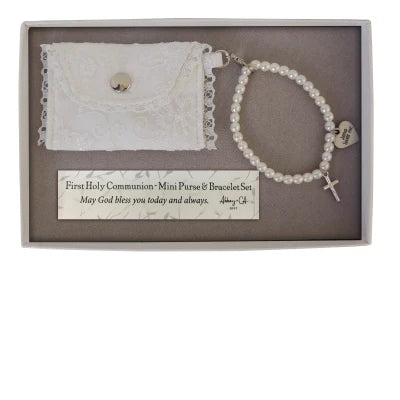 Celebrate a cherished milestone with this exquisite mini purse and pearl bracelet set. Perfect for a young girl's First Communion, the dainty purse and elegant bracelet offer a touch of grace and sophistication. Presented in a beautifully boxed gift, it's a memorable keepsake to mark this sacred occasion.