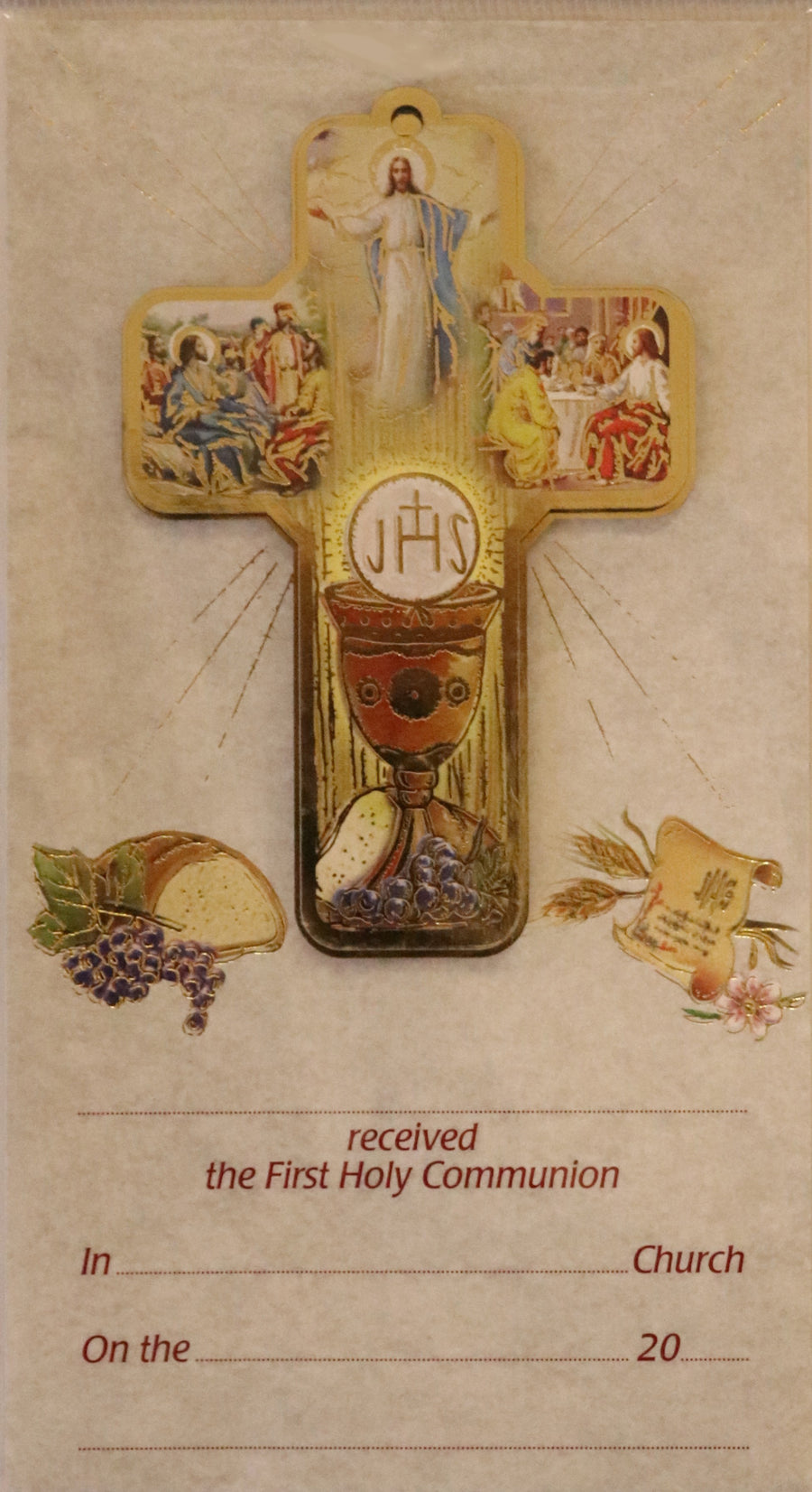 This 5" wood cross comes with beautiful gold foil eucharist art and a first communion card with a certificate on the front and a prayer on the back.