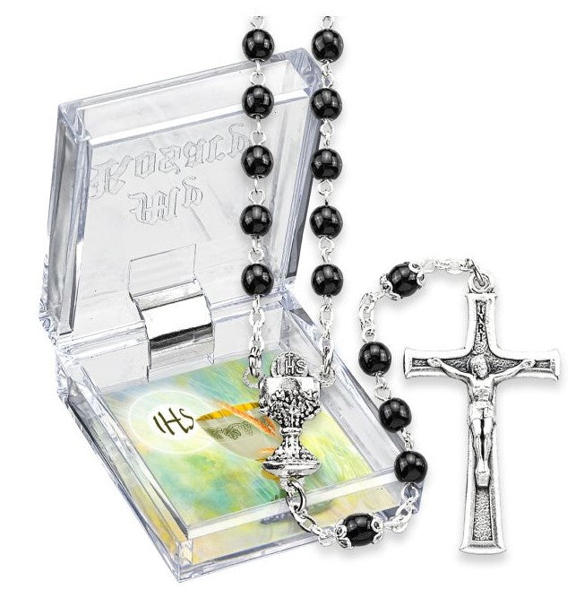 - 5mm Black Glass Bead Rosary with Capped Our Father Beads.