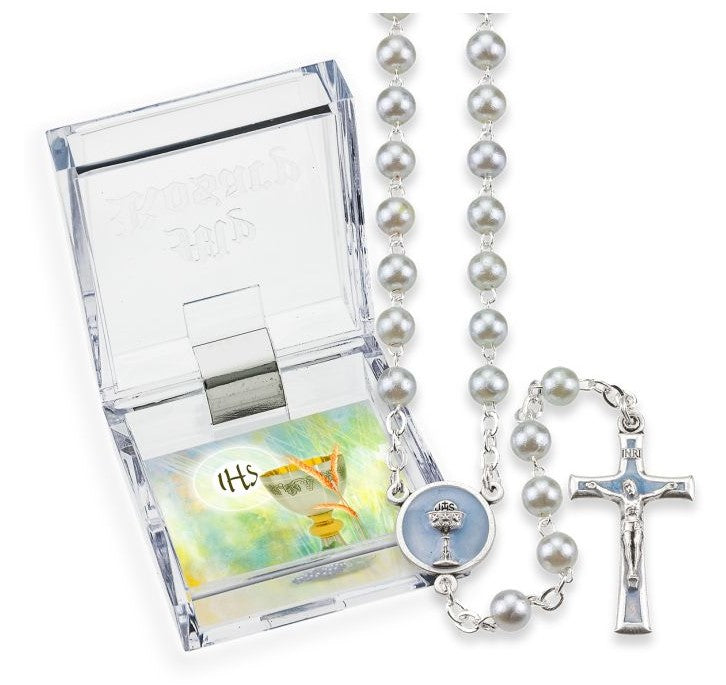 5mm Blue Pearlized Glass Bead First Communion Rosary, Boxed