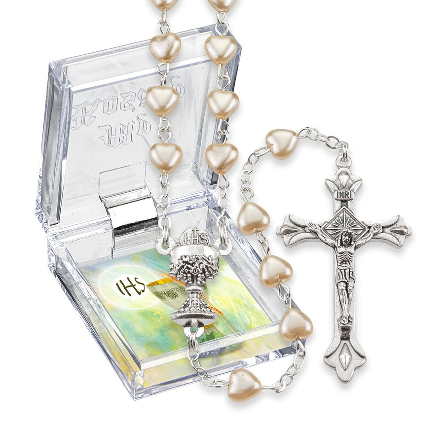 - 5mm Heart Shaped Cream Pearlized Glass Bead Rosary.