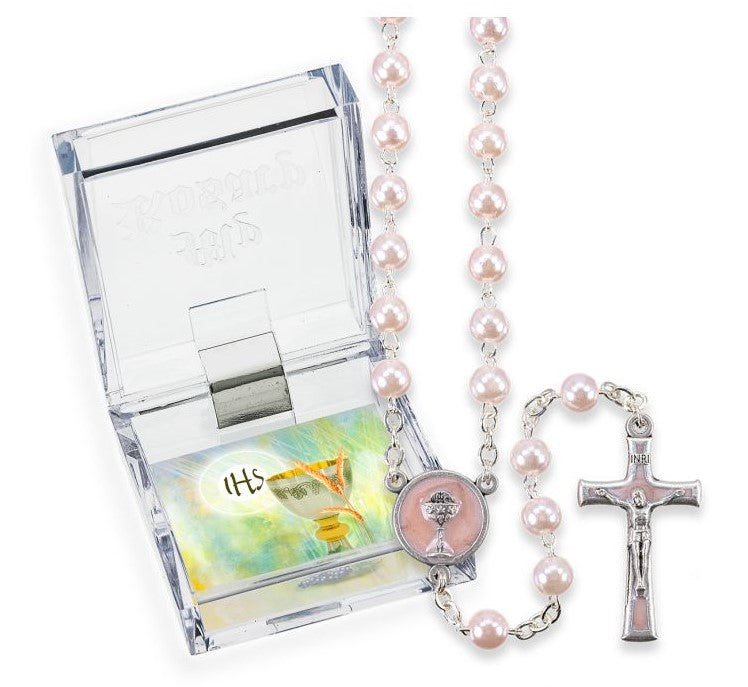 5mm Pink Pearlized Glass Bead First Communion Rosary, Boxed