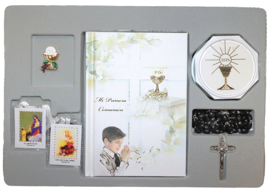 This boxed set includes a hard cover missal in Spanish, a gift set rosary with case, a laminated scapular, and a gold chalice pin.