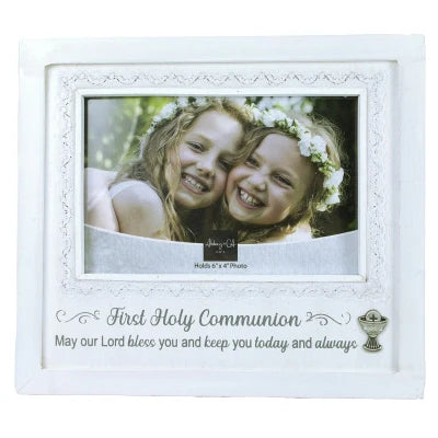 This frame has real lace and a metal chalice accent and is a perfect gift and keepsake for First Communion. Holds 4" x 6" photo. Frame dimensions are 7.5" x 8.5".