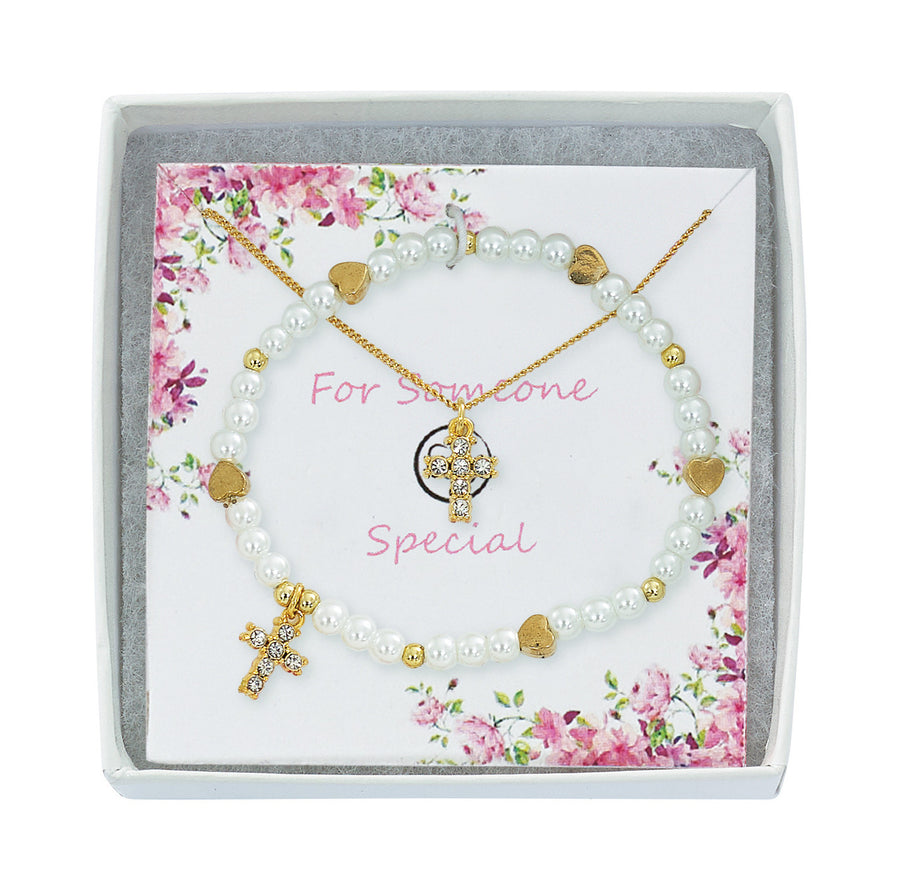 Gold Plated Pearl Stretch Bracelet Set with Crystal Cross Pendant. Comes on Someone Special Card and Box
