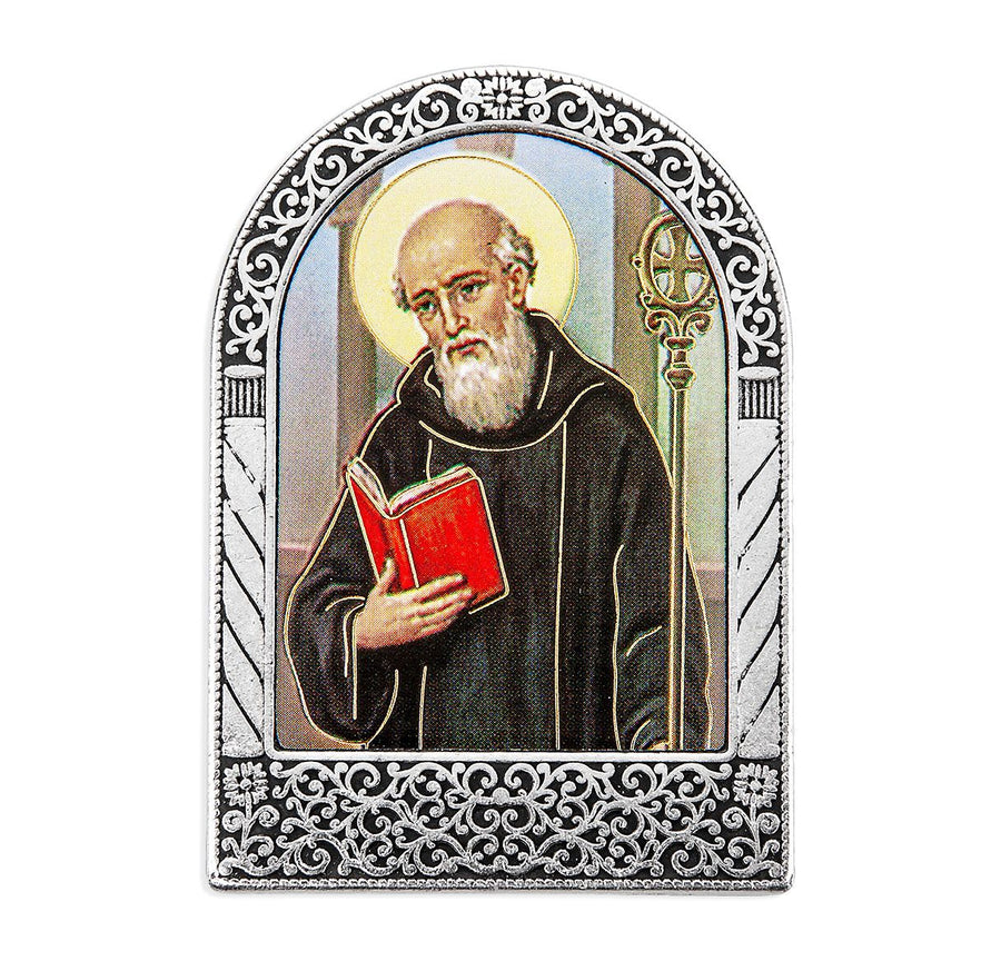 Antique Silver Metal Arched Easel with Gold Embossed St. Benedict Print