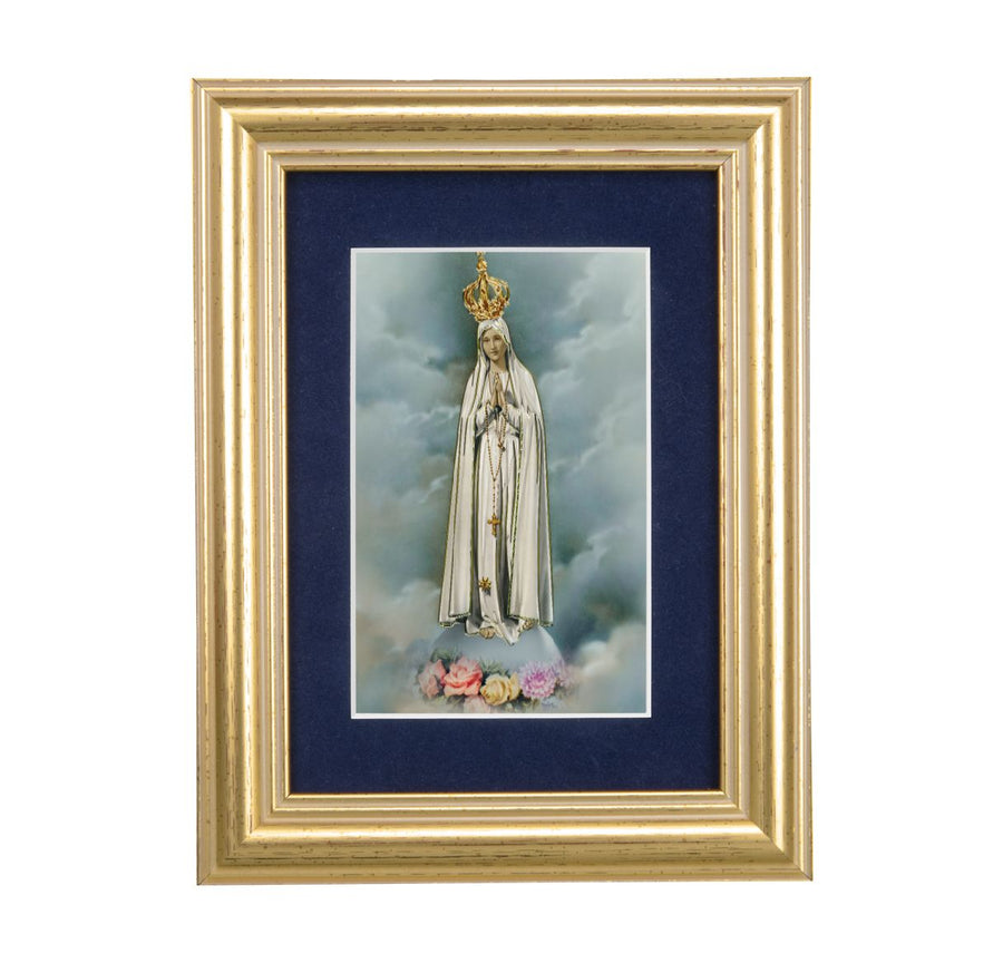 Our Gold Framed Italian Prints are elegant, and beautiful quality. Our 'Our Lady of Fatima' image is from our exclusive Italian 'Bonella' collection, and sits in our wood gold frame, with soft velvet blue matting, under glass. This elegant framed art is the perfect gift for any occasion. Give as a special gift for Weddings, Anniversaries, Birthdays, or Christmas.