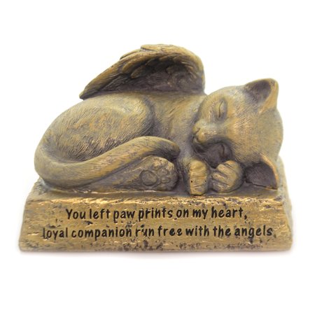This sleeping angelic cat lays on top of a pedestal with the sentiment: "you left paw prints on my heart, loyal companion run free with the angels." This memorial garden statue is part of Roman's renowned Garden collection. The impeccable finish and realistic texture brings whimsical charm to any outdoor space while bring a sense of piece as you remember your furry friend. This unique statue is carefully constructed of high-quality resin and stone, rendering it very durable and long-lasting in a garden, yard, porch, or patio setting year round. It measures approximately 6"H x 3.9"W x 6"L. The statue is beautifully detailed with a stone finish and golden glow that helps you remember your special pet always. The intricate painting, features, and design of Roman's Garden collection items make pieces splendid works of art in any outdoor space.