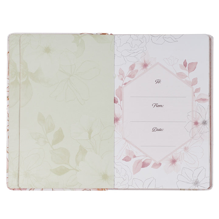 The prayer book is more than merely a collection of prayers; it is a treasure trove of blessings for all circumstances. It features a presentation page at the front that can be customized to make it truly yours. The interior pages are printed in two colors, and the floral motif from the cover is carried through to decorate the interior pages. Each daily entry features several Scripture verses followed by a blessing.