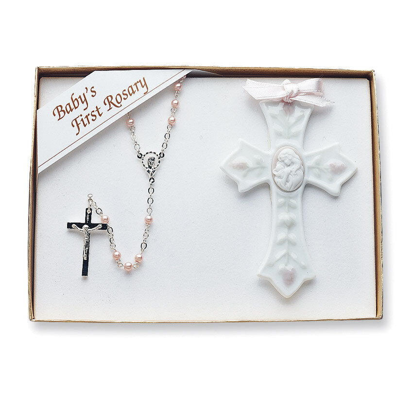 Set features a beautiful pink faux-pearl rosary with silver links and crucifix, and a fine porcelain cross with soft pink luxurious detail.