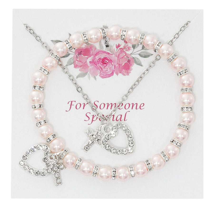 Crystal & Pink Pearl Stretch Bracelet With Crystal Cross And Heart Pendant. Comes On Someone Special Card And Boxed