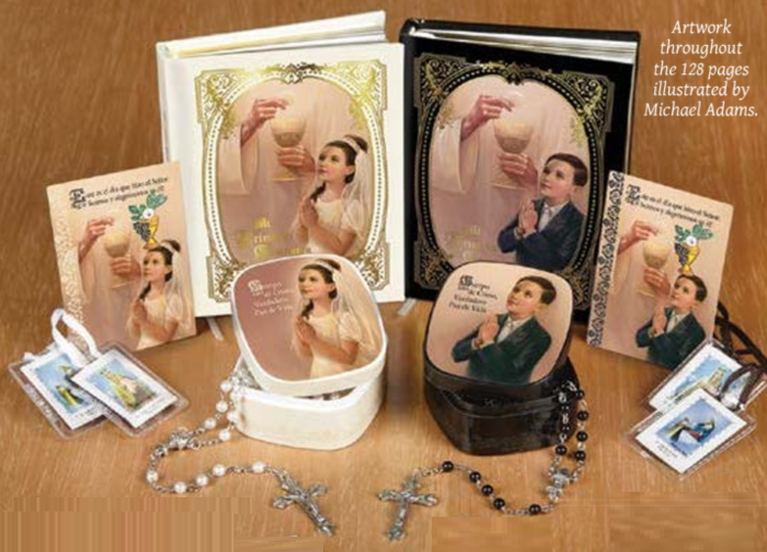 Each set includes a 128-page First Communion Mass book in Spanish, scapular rosary, lapel pin on card and moulded rosary case.