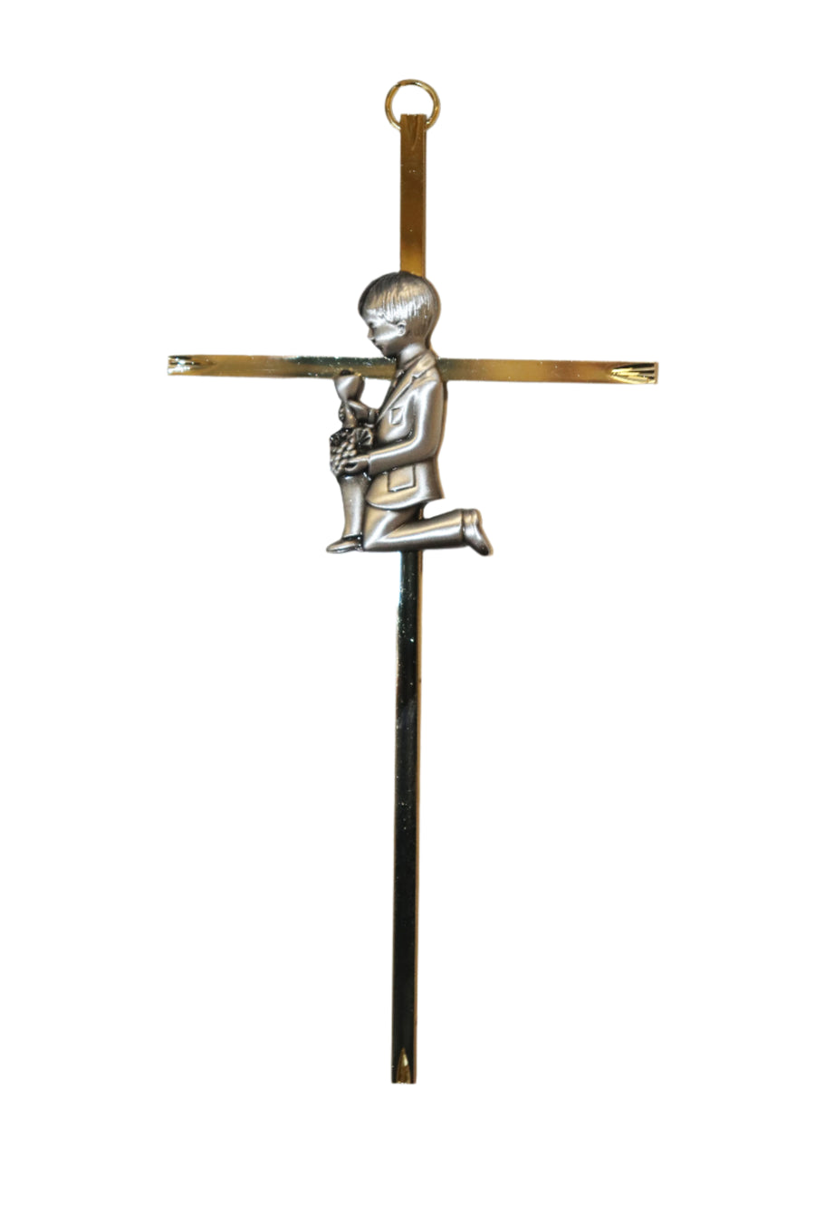 7" Gold plated solid brass wall cross with engraved tips and pewter finished boy.