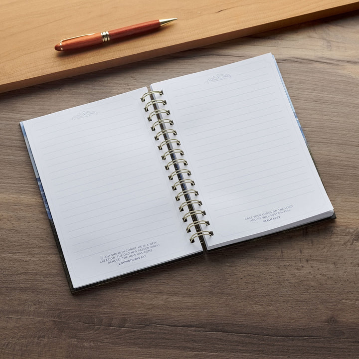 The spiral journal's cover captures the grandeur of God's creation with a breathtaking mountain scene in the background and evergreen trees trimming the foreground. A navy-blue cartouche frame that displays the sentiment is accented with elegant gold-foiled scrolls. The sentiment is presented in white silver foil outlined letters.