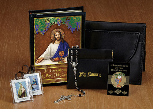 Each set includes a 128-page Mass book, scapular, rosary, lapel pin, leatherette rosary case and leatherette wallet. Each mass book contains the Order of the Mass, the story of Jesus, favorite Catholic prayers, the 20 Mysteries of the Rosary, the Stations of the Cross and the Sacrament of Reconciliation with an Examination of Conscience and "How to Go to Confession," all beautifully illustrated by renowned artist Michael Adams. -- Mass Book, Scapular, Rosary, Lapel Pin, Vinyl Rosary Case, Leatherette Wallet, Boxed