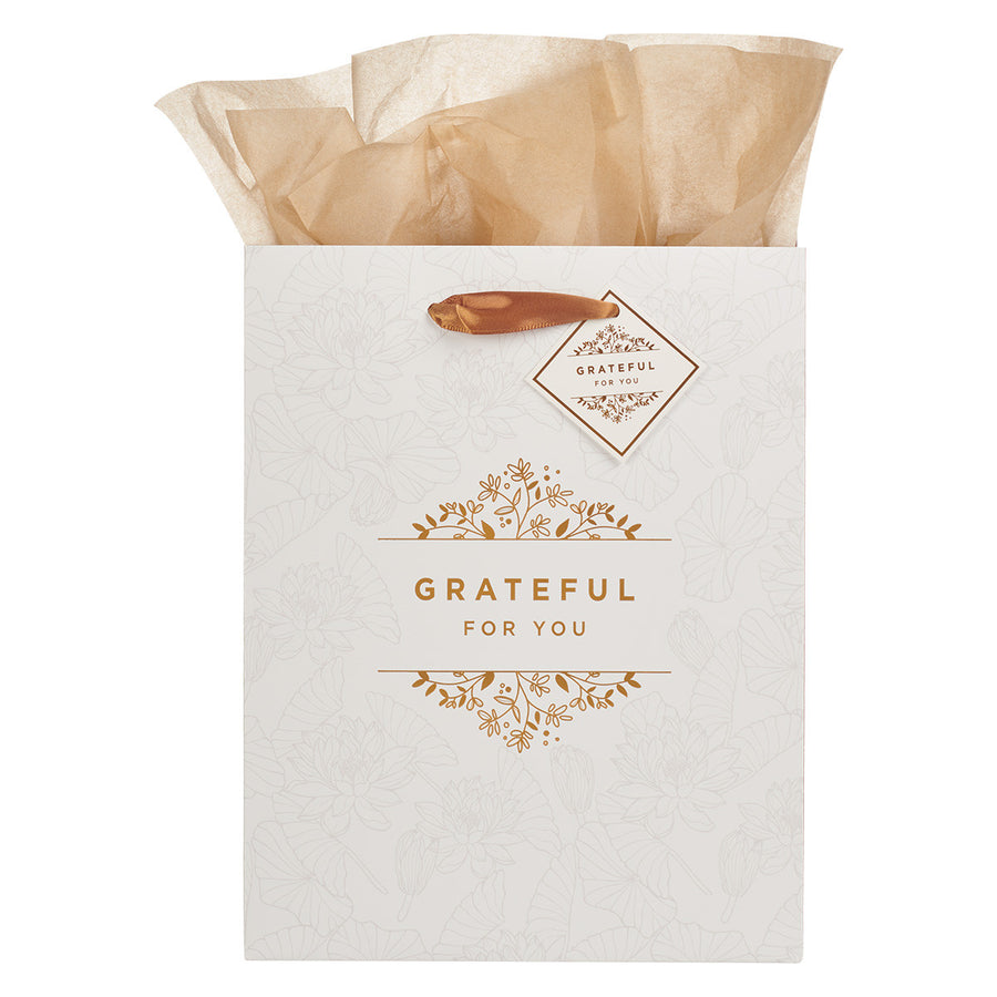 The Grateful For You White and Gold Medium Gift Bag is a lovely way to present a beautiful gift to a special person.