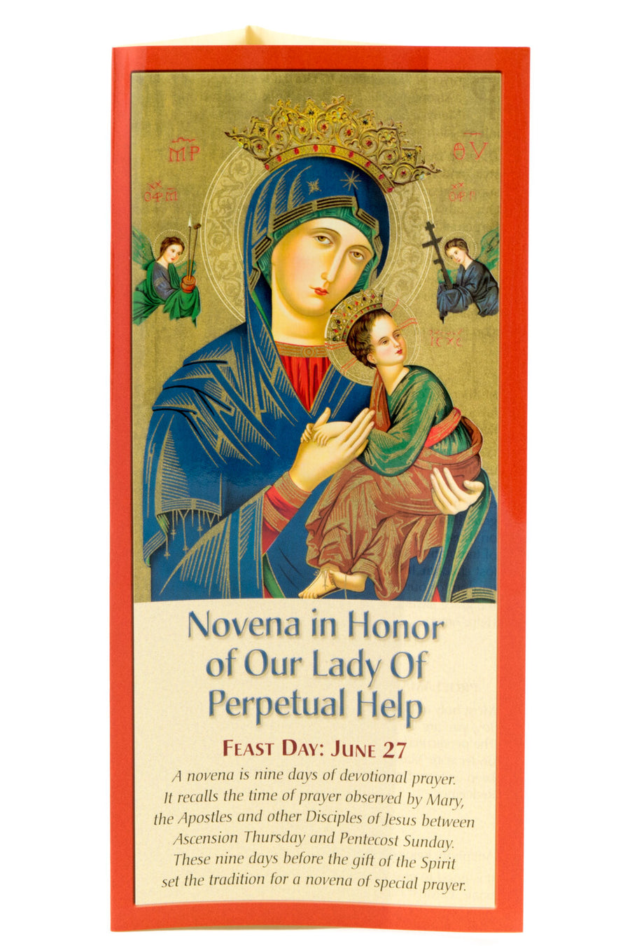 A novena is nine days of devotional prayer that recalls the time Mary, the Apostles, and the other Disciples spent in prayer waiting for the Holy Spirit. This beautifully illustrated 5-panel laminated prayer pamphlet is dedicated to Our Lady of Perpetual Help. Our Blessed Mother is celebrated under this title June 27th.