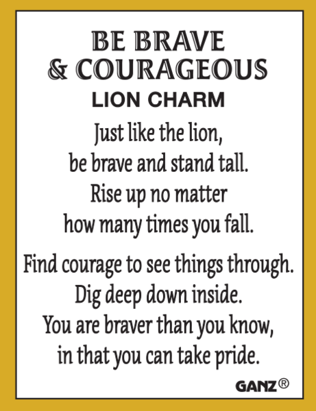 The Be Brave & Courageous Lion Charm comes with a card that reads "Just like the lion, be brave and stand tall. Rise up no matter how many times you fall. Find courage to see things through. Dig deep down inside. You are braver than you know, in that you can take pride".