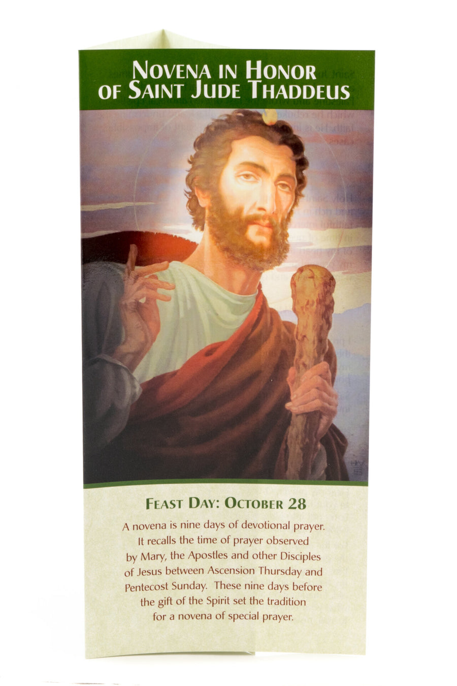 A novena is nine days of devotional prayer that recalls the time Mary, the Apostles, and the other Disciples spent in prayer waiting for the Holy Spirit. This beautifully illustrated tri-fold laminated prayer pamphlet is dedicated to St. Jude. St. Jude's feast day is celebrated on October 28.